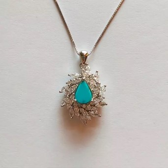 سنگ فیروزه یکی از سنگ های زیبا و چشم نواز است و معمولا در طیف رنگی آبی آسمانی روشن تا سبز خاکستری وجود دارد.یکی از خواص این نوع سنگ دفع انرژی های منفی می باشد و باعث آرامش و دوری از استرس می شود که می توانید گردنبند آن را تهیه کنید قیمت گردنبند با نگین فیروزه از 2 میلیون تومان شروع می شود