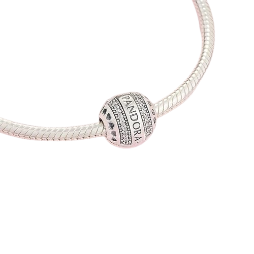 کلیپ محافظ ظریف با طراحی لوگوی «PANDORA»، تزئینشده با درخشش نگینهای شفاف و قلبهای برجسته؛ همراه با گیره سیلیکونی داخلی جهت حفظ جایگاه چارمها. جزئیاتی کلاسیک و ماندگار برای هر دستبند.اگر به دنبال ترکیبی از طراحی برندمحور و کاربردی هستی، کلیپ گرد لوگوی پاندورا یک گزینه کلاسیک و خاص برای مجموعهات خواهد بود.