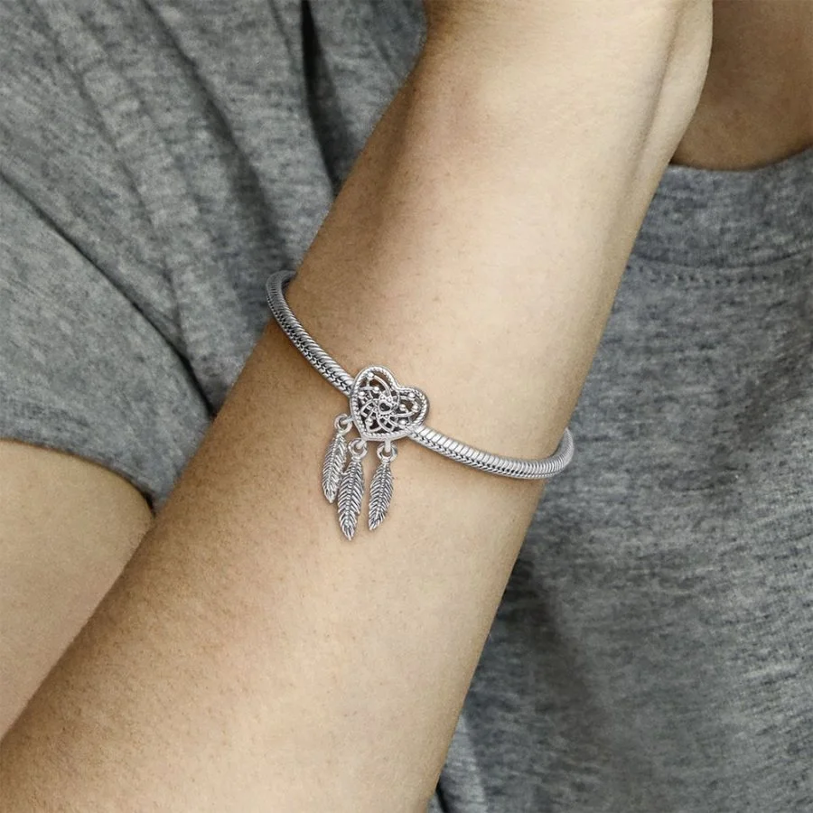 این چارم رؤیایی از نقره استرلینگ ساخته شده و ترکیبی از طرح قلب توخالی و سه پر آویز را به نمایش میگذارد. طراحی آن الهامگرفته از دریمکچر (Dreamcatcher) یا همان «تلهٔ رویاها» است که در فرهنگ بومیان آمریکایی نمادی از محافظت، آرامش و رؤیاهای زیباست. ساختار باز (Openwork) آن، حس سبکی و جریان انرژی مثبت را منتقل میکند — قطعهای آرامبخش و پرمعنا برای هر مجموعه Moments.با چارم قلب و سه پر دریمکچر پاندورا، انرژی مثبت و رؤیاهای زیبا را همیشه همراه خود داشته باشید — نمادی شاعرانه از آرامش و عشق.