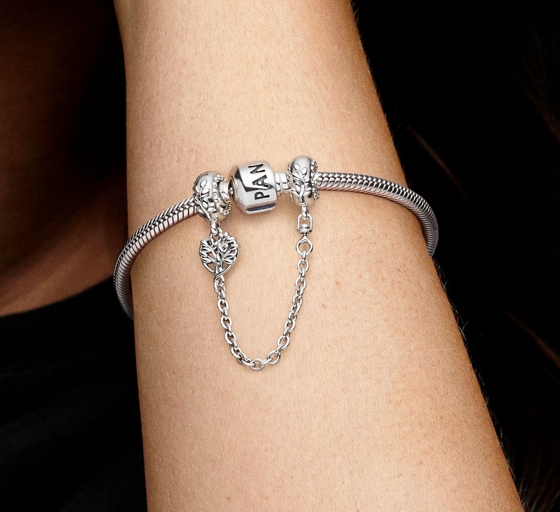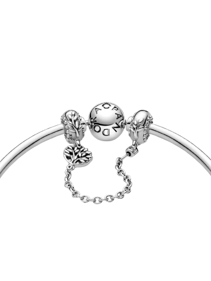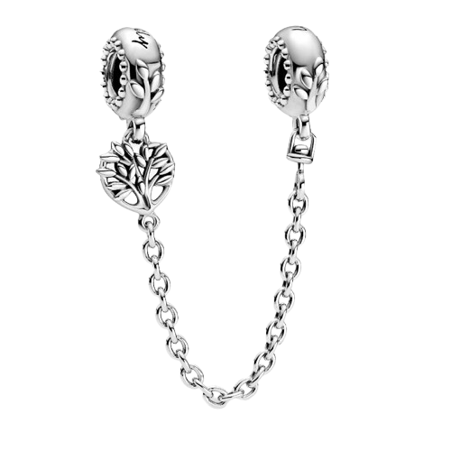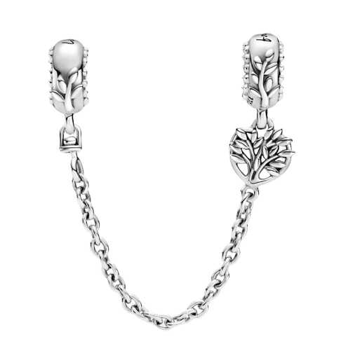 زنجیر ایمنی با طرح قلب و موتیف «درخت خانواده» که علاوه بر زیبایی، امنیت چارمها را هنگام باز و بستهشدن قفل تضمین میکند. ساختهشده از نقره استرلینگ با جزئیات برگ و حکاکی ظریف.